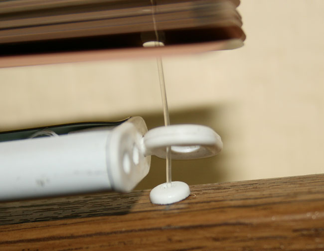 Фиксация данных видов жалюзи производится при помощи лески. Леска не позволяет изделию провисать при установке в положение проветривания, открывании и закрывании окна.